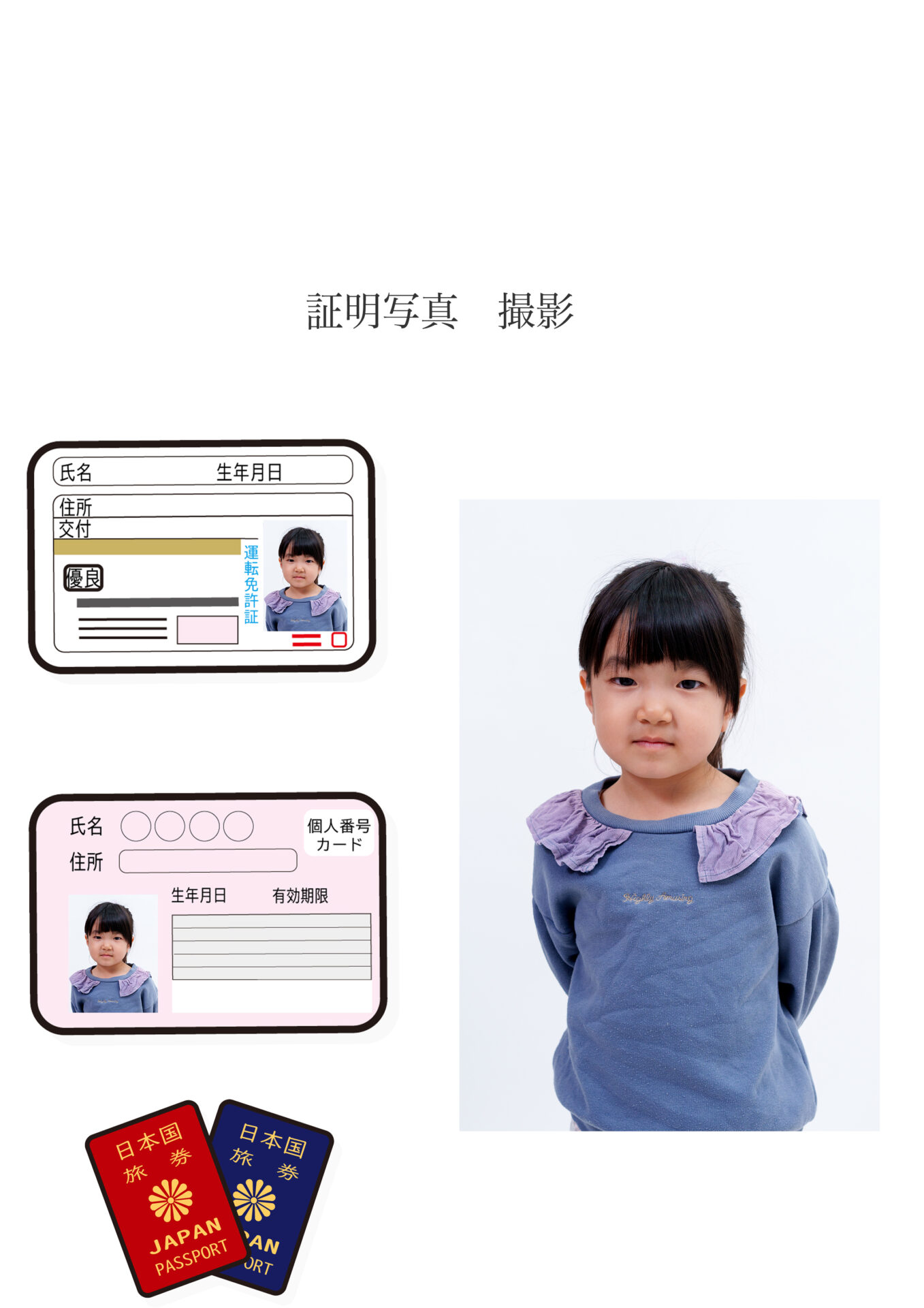 SNSやHPのほか、チラシや名刺、マイナンバーカードや免許証など様々な用途にご利用いただけます。
